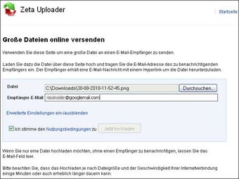 Die Bedienung von Zeta Uploader ist äußert einfach: Man lädt eine Datei hoch, gibt optional die E-Mail-Adresse eines Empfängers ein, stimmt den Nutzungsbedingungen zu und klickt auf Jetzt hochladen. Der Dateiaustauschdienst erstellt in Sekundenschnelle eine URL mit dem Zugang zur Datei.